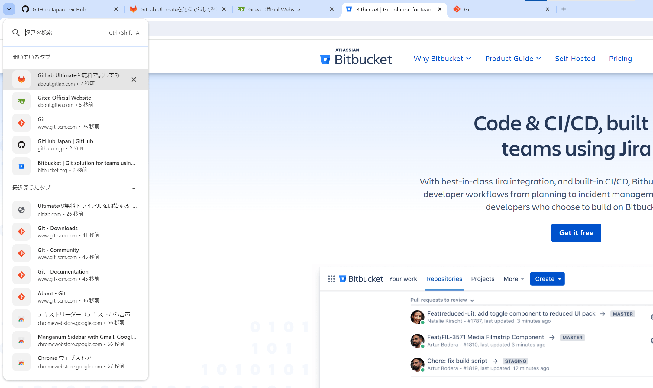 これは開いているタブをポップアップで一覧表示し、検索を可能にする機能です。この画像の例では直近にGitLabを開いていました。どうやらこの一覧では直近開いていたタブが一番上にフォーカスされた状態で表示されるらしいです。そのため、この状態でEnterを押下すると直近開いていたGitLabタブに移動します。