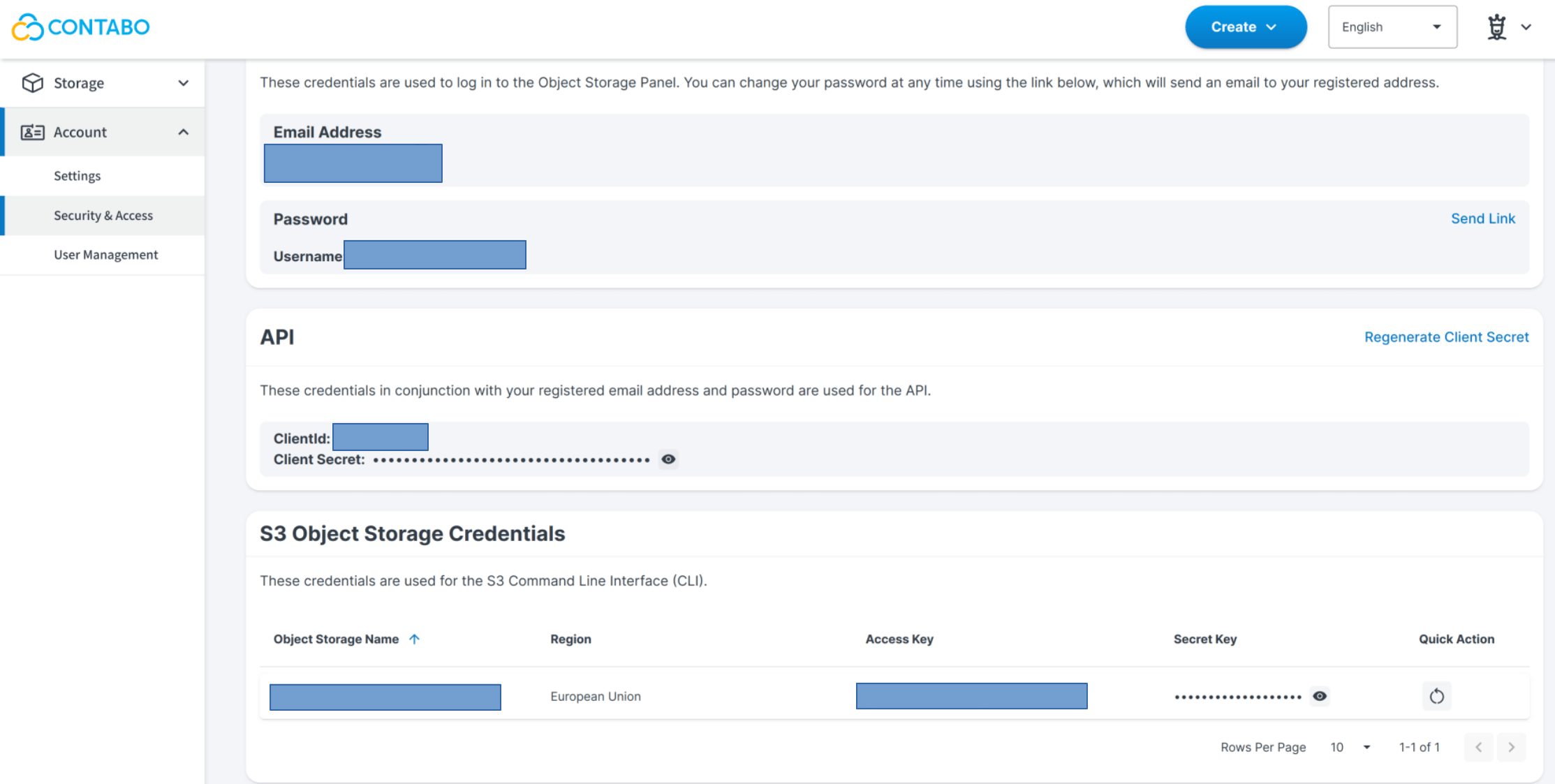 接続にはアクセスキーとシークレットキーが必要です。これはContaboの画面から取得できます。