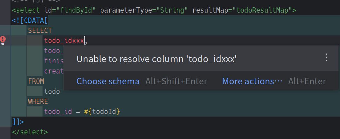 また、こちらはmybatisのXMLファイルなのですが、エディタをDBに接続するとこのようなファイル中のSQLにも補完などが効きます。
