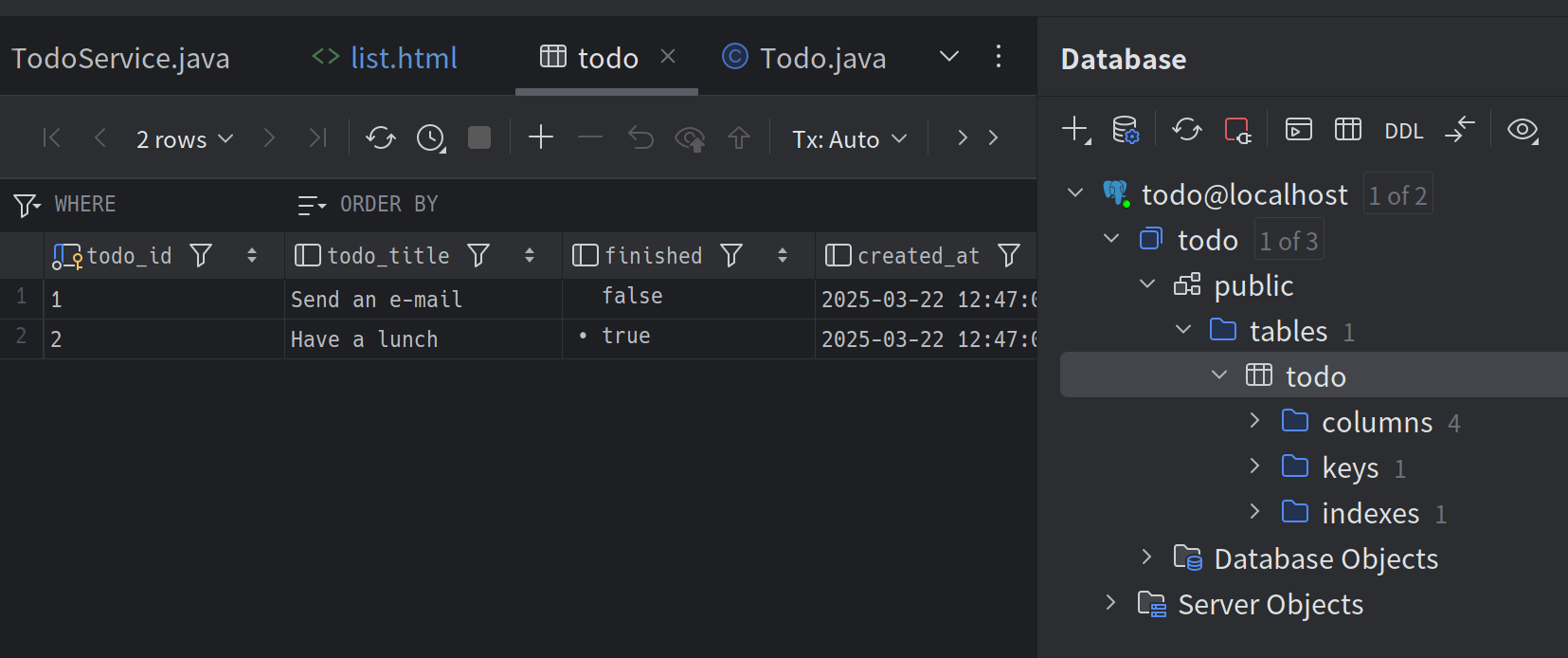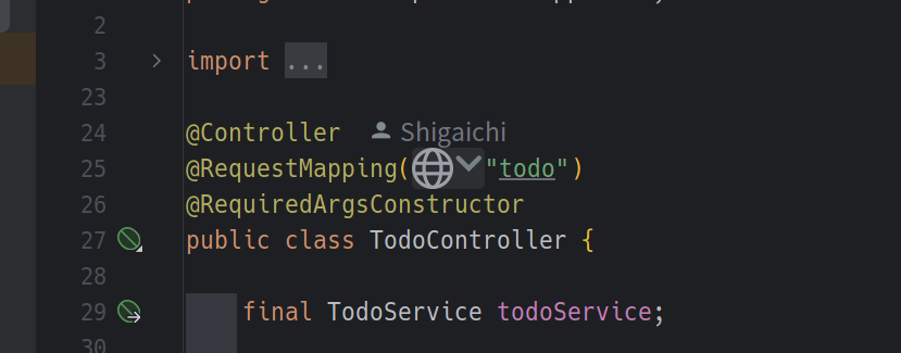 例えば、final TodoService todoService;の行にマークがついています。このマークをクリックするとTodoServiceを実装しているTodoServiceImplへ一気にジャンプできます。