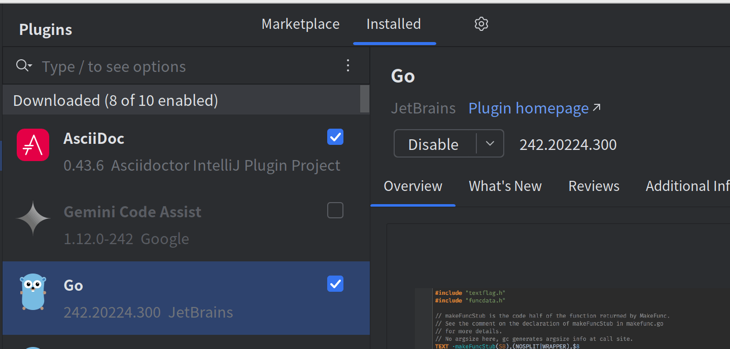 有料版の場合はGo用のプラグインがあり、これを導入するとJavaなどと同じように高度に補完などを効かせて開発することができます。