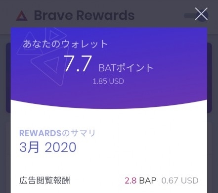報酬は現金ではなく、BATポイントと言う形で受け取ります。本来はBAT(Basic Attention Token)というトークンを受け取れるのですが、法律の都合で日本ではBATポイントの受け取りになります。