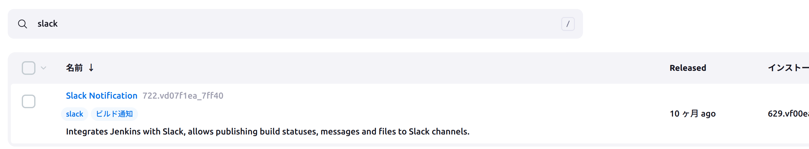 Jenkinsの「プラグイン管理」(/manage/pluginManager/available)画面から、Slack Notification プラグインをインストールします。