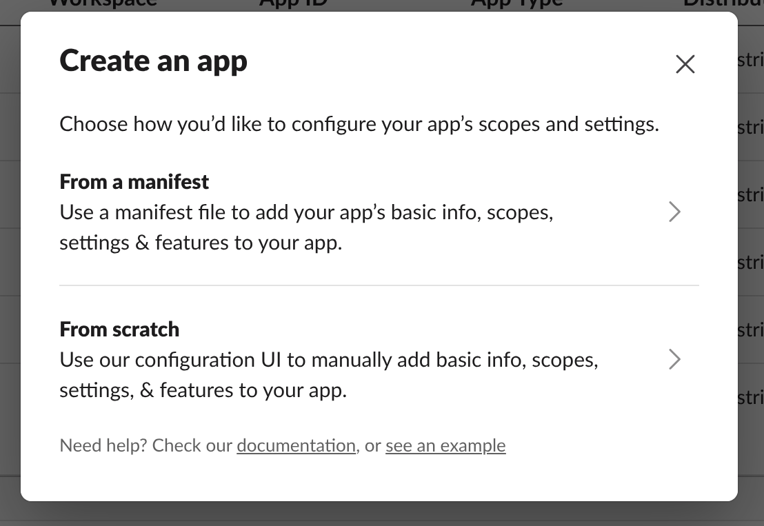 「Create New App」を押すとモーダルが開きます。ここでFrom a manifestを選択します。