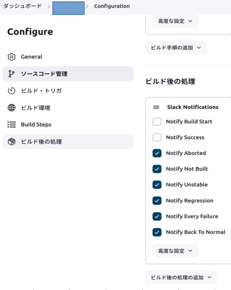 各ジョブの設定画面で最下部に「ビルド後の処理」があるので、「ビルド後の処理の追加」を押下し、「Slack Notification」を選択します。